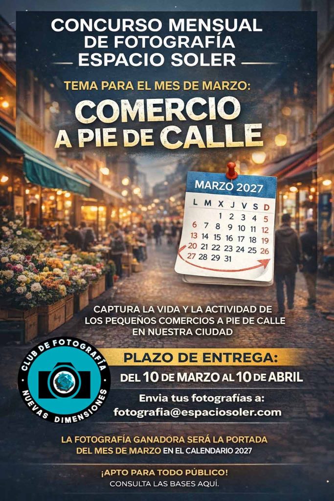 Las calles de nuestras ciudades están llenas de vida, historia y actividad. En este mes de marzo queremos poner el foco en el comercio a pie de calle, esos negocios que forman parte del pulso cotidiano del barrio: tiendas tradicionales, mercados, bares, panaderías, librerías, escaparates o cualquier escena que refleje la relación entre el comercio y la vida urbana. Tu reto es capturar la esencia del pequeño comercio y la actividad que se vive en las calles: No se trata solo de documentar un comercio, sino de mostrar la historia, el ambiente y la humanidad que hay detrás de cada negocio. 📅 Fechas de entrega Del 10 de marzo al 10 de abril 📩 Envío de fotografías Envía tus fotografías al correo:📧 fotografia@espaciosoler.com Cada participante podrá enviar hasta un máximo de dos fotografías. ¿Cómo funciona? Cada mes tendrá un sub-tema específico dentro del entorno urbano. El día 1 de cada mes, recordaremos el tema vigente en nuestras redes sociales. Tienes hasta el día 15 del mes siguiente para enviar tus capturas. Requisitos del concurso: Formato: No se permite Inteligencia Artificial. Las imágenes deben ser originales, en formato A4 horizontal, apaisado resolución mínima de 300 ppp y formato JPG. Público: Abierto a todos los entusiastas de la fotografía, sin límite de edad. Temática: Fotografías centradas en el entorno urbano (ciudad o cualquier núcleo urbano). cada mes se publica un tema. Envíos: Máximo de dos fotografías por participante cada mes. correo : fotografia@espaciosoler.com Técnica: Se admite cámara analógica, digital o smartphone.