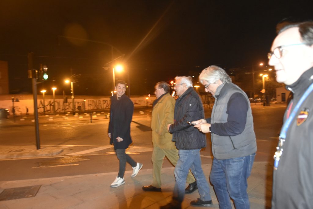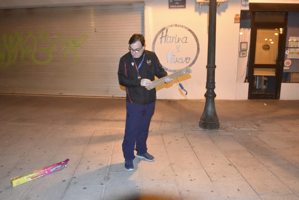 La celebración comenzó con una tirada de tracas en la puerta de la entrada del antiguo campo del Levante UD, en la Calle Poeta Bodría, seguida de una foto grupal para conmemorar el momento.