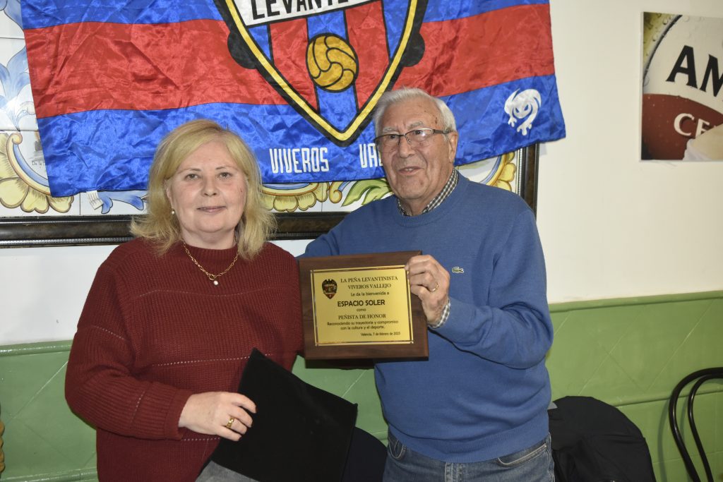 Para concluir, se hicieron reconocimientos especiales a Espacio Soler (Nuevas dimensiones), agradeciendo su compromiso con la Cultural y el Deporte, nombrándole como peñista de honor. MariaJo fue la encargada de entregar el obsequio, el cual fue recibido por su director Juan Maceda, (Exjugador del C.D. Acero de Puerto Sagunto) junto a Paolo Fistetto (directivo de la Espacio Soler ).