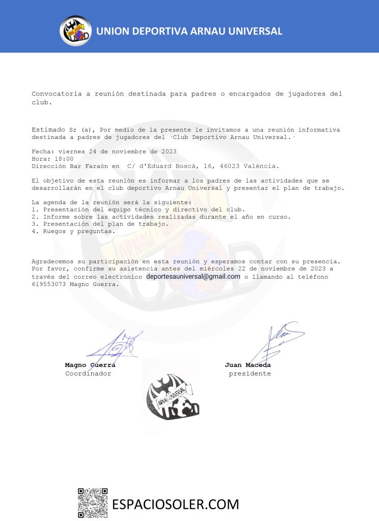 La Unión Deportiva Arnau Universal convoca a los padres/madres o encargados /as de jugadores que actualmente entrenan en el club y que participarán en la próxima temporada deportiva a una reunión informativa previa al comienzo de la misma en la que se expondrán los aspectos mas importantes y novedades para este nuevo e ilusionante periodo deportivo.